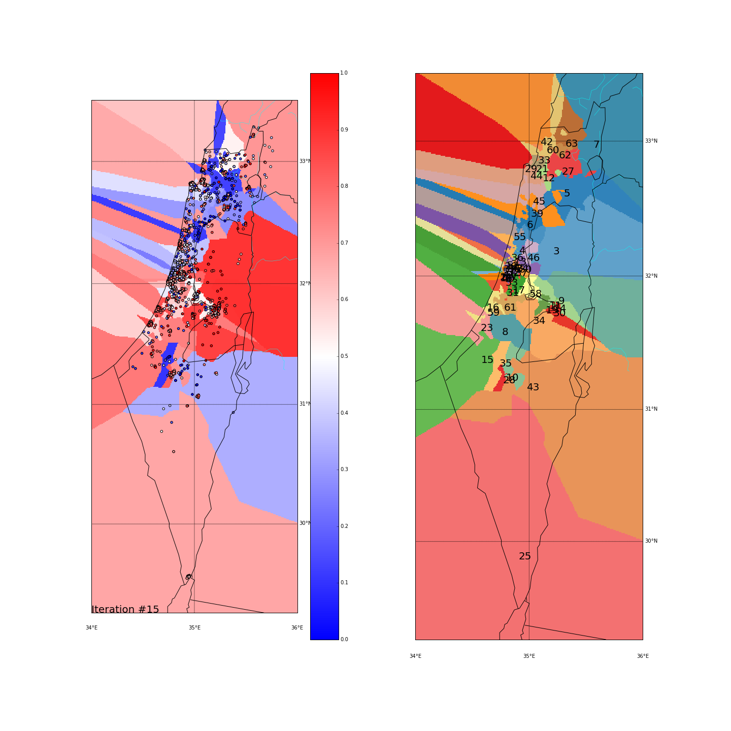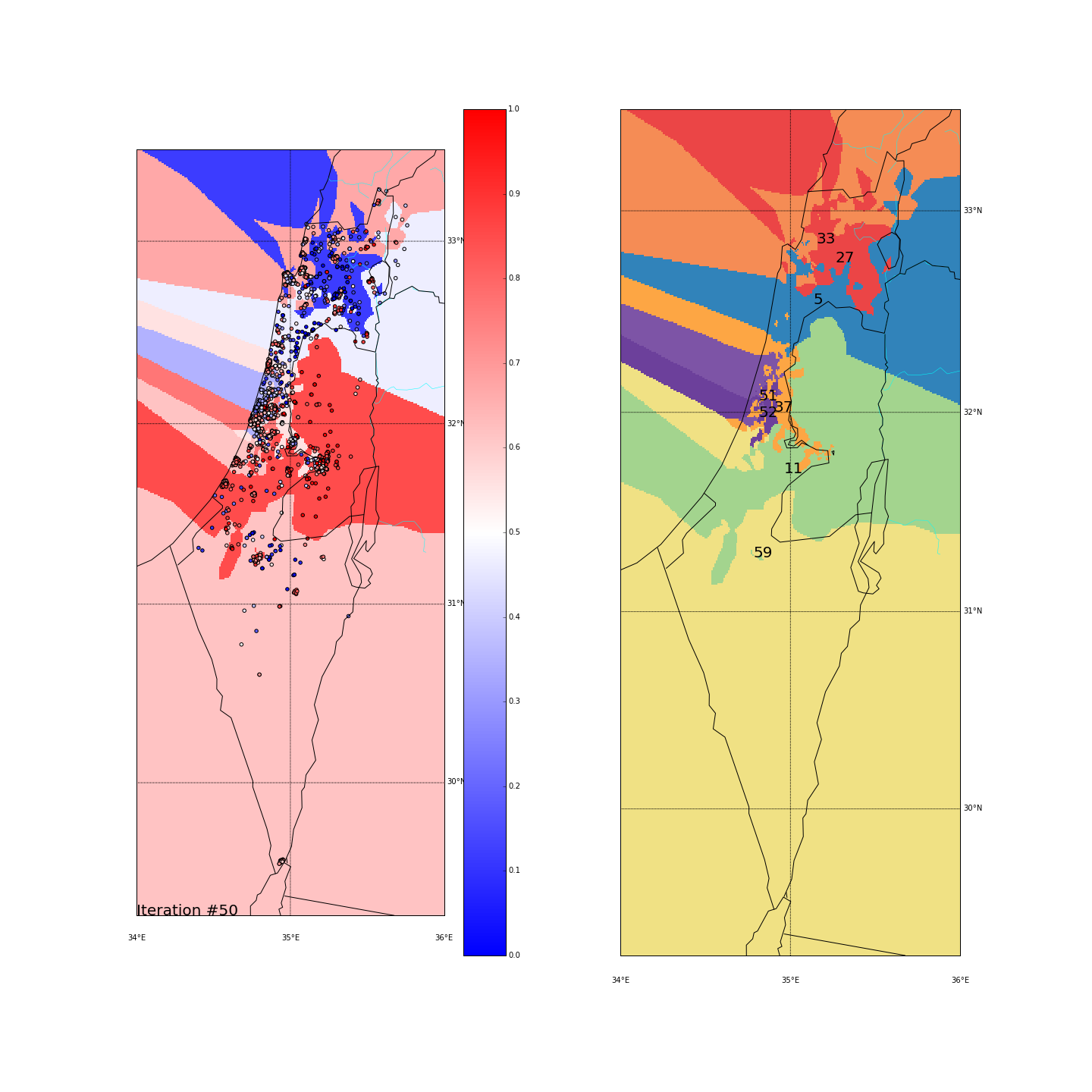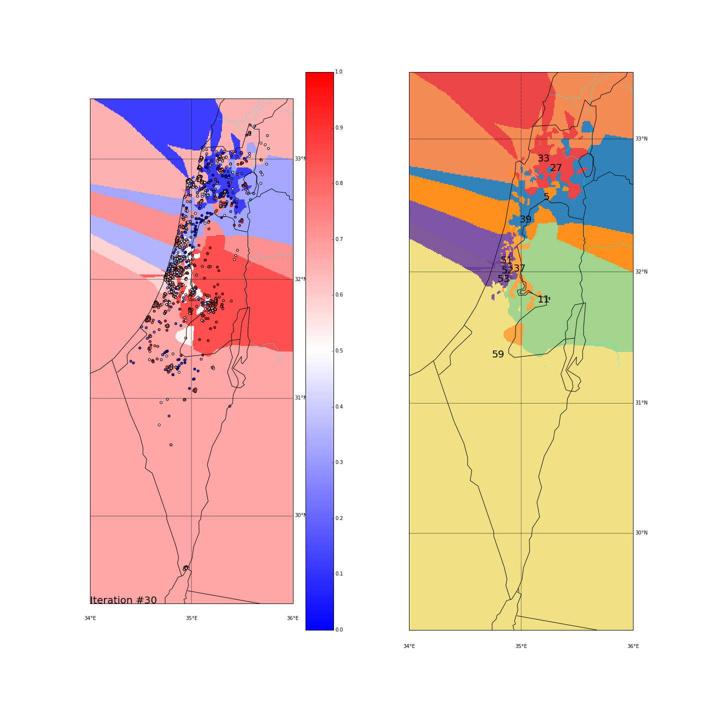 I’ve used KMeans with K=8, without adding the side_score as another dimension. I did however test 2 different spaces for the points. One is the regular (long,lat) space, the other is the distance-from-major-cities space where every (long,lat) point is converted into the distance from Tel Aviv, Jerusalem and Haifa. Hopefully that would give more “natural” clusters.