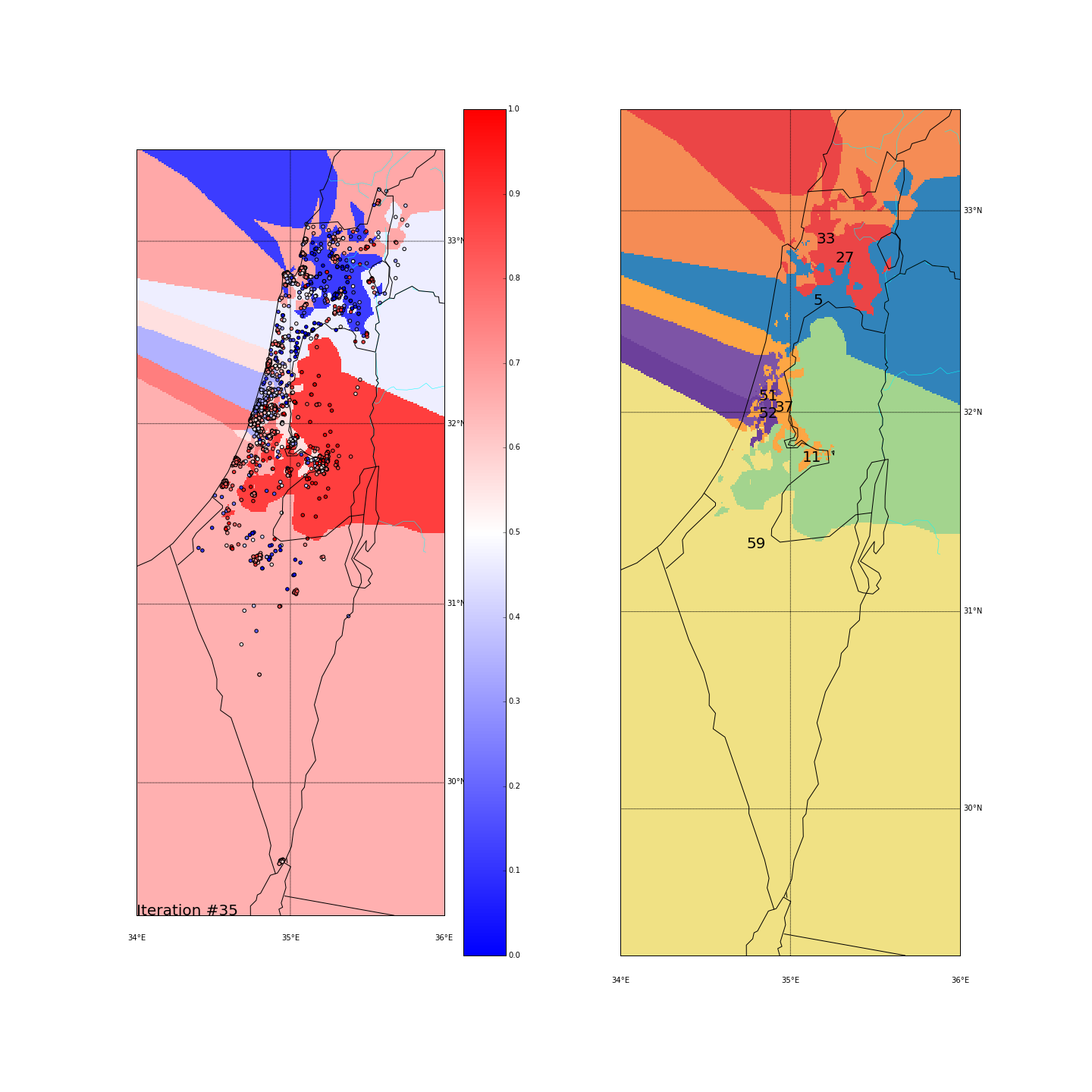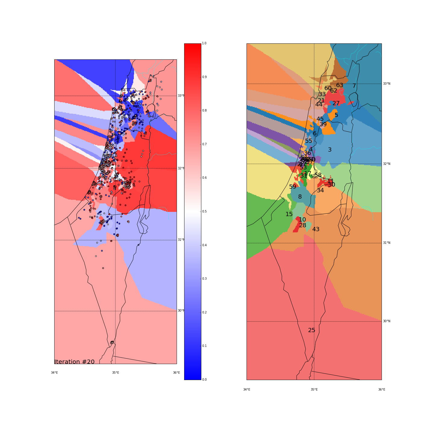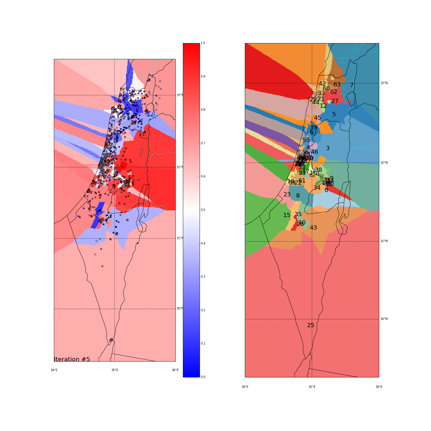 I’ve used KMeans with K=8, without adding the side_score as another dimension. I did however test 2 different spaces for the points. One is the regular (long,lat) space, the other is the distance-from-major-cities space where every (long,lat) point is converted into the distance from Tel Aviv, Jerusalem and Haifa. Hopefully that would give more “natural” clusters.