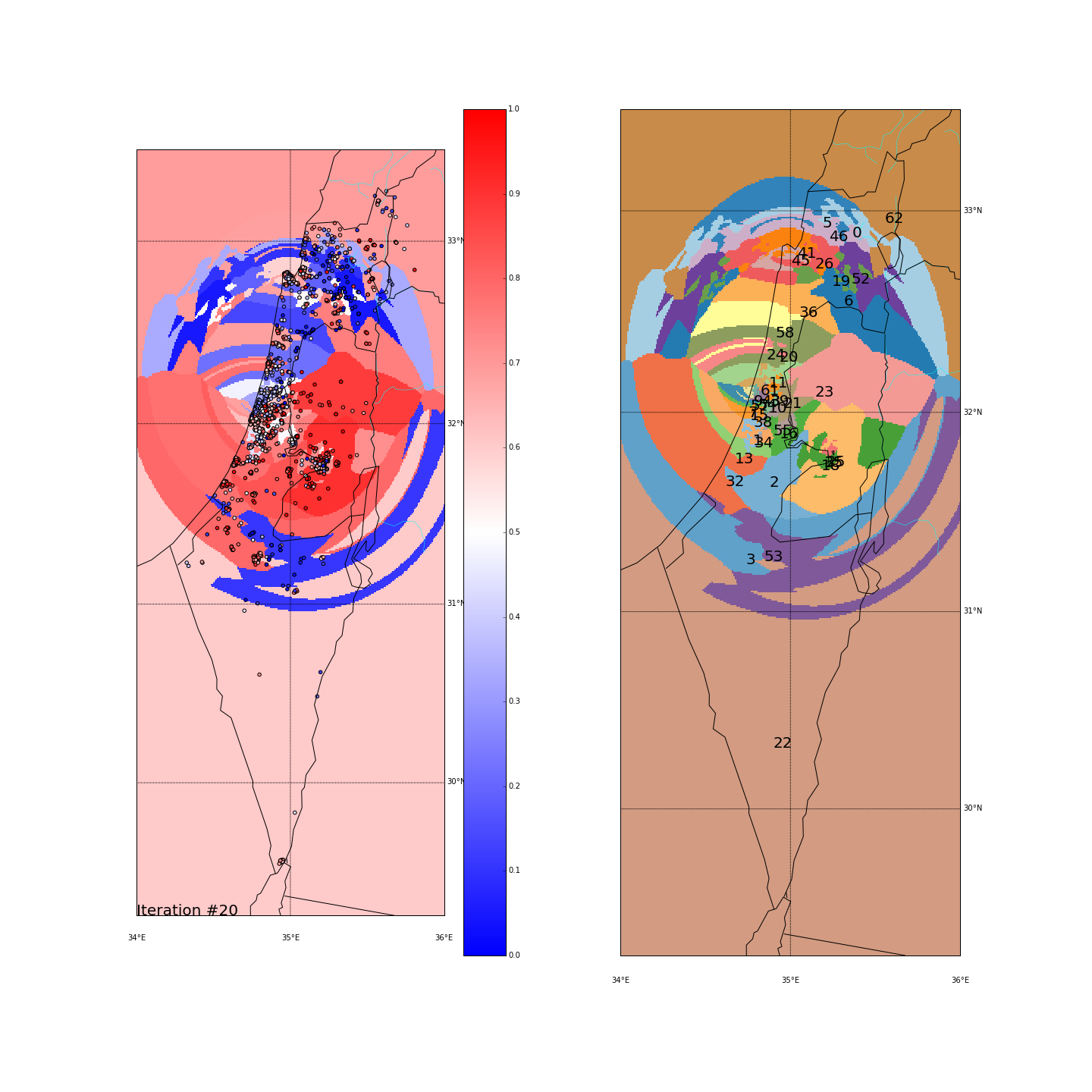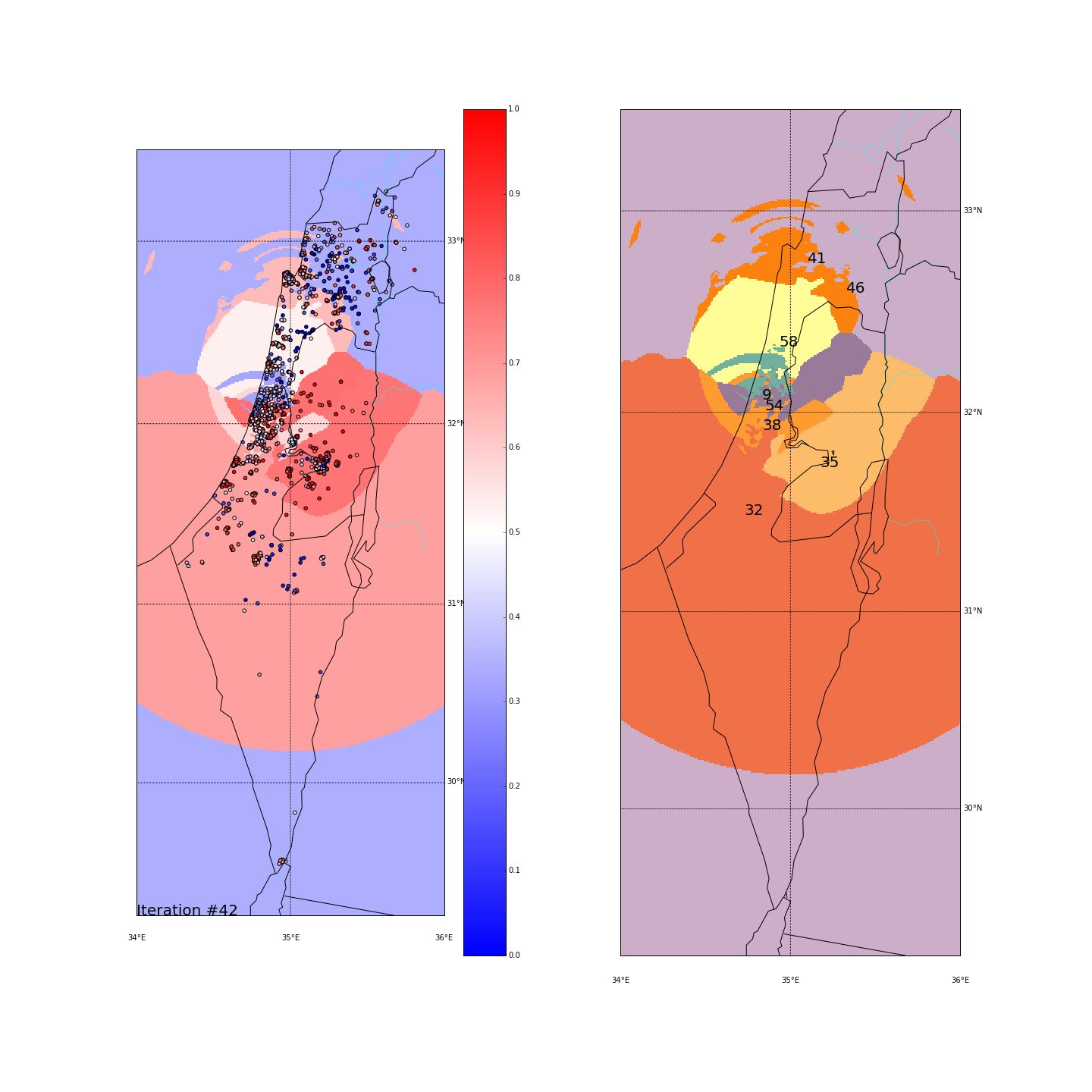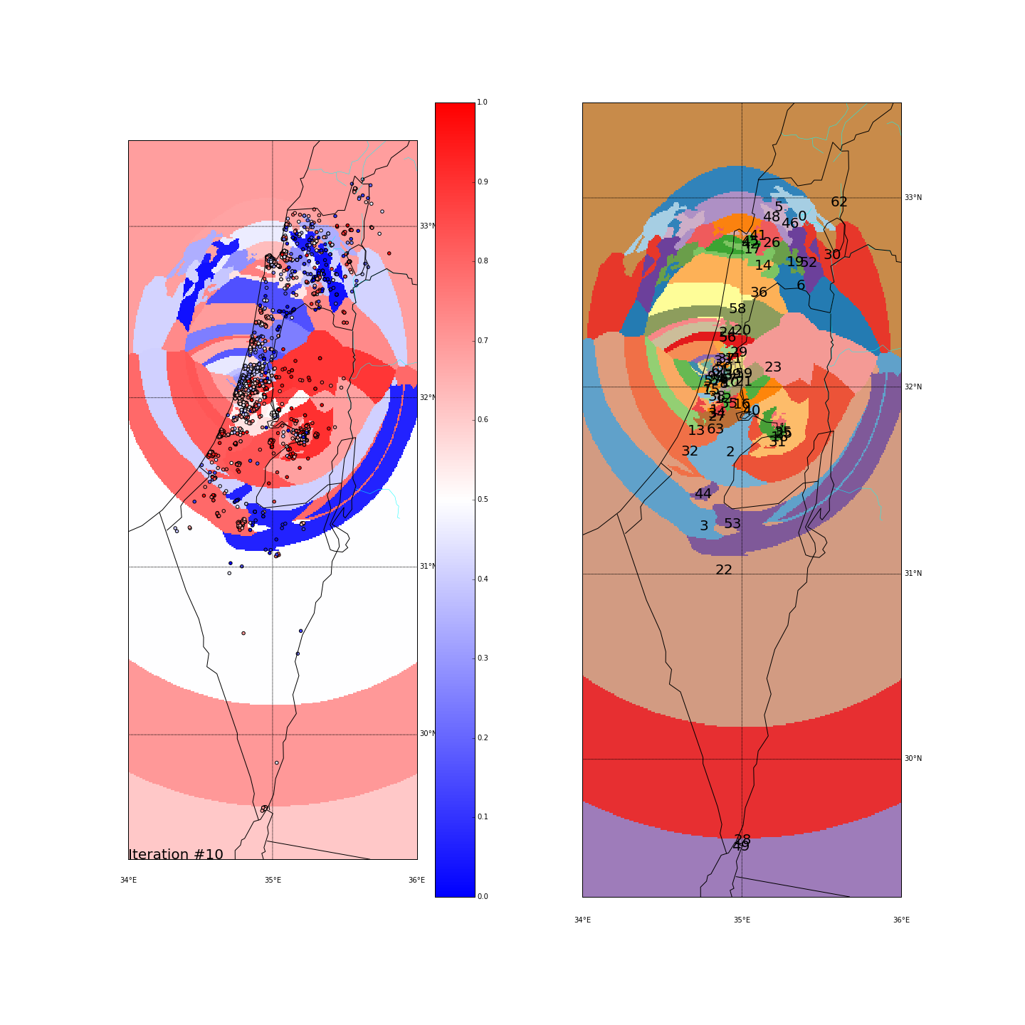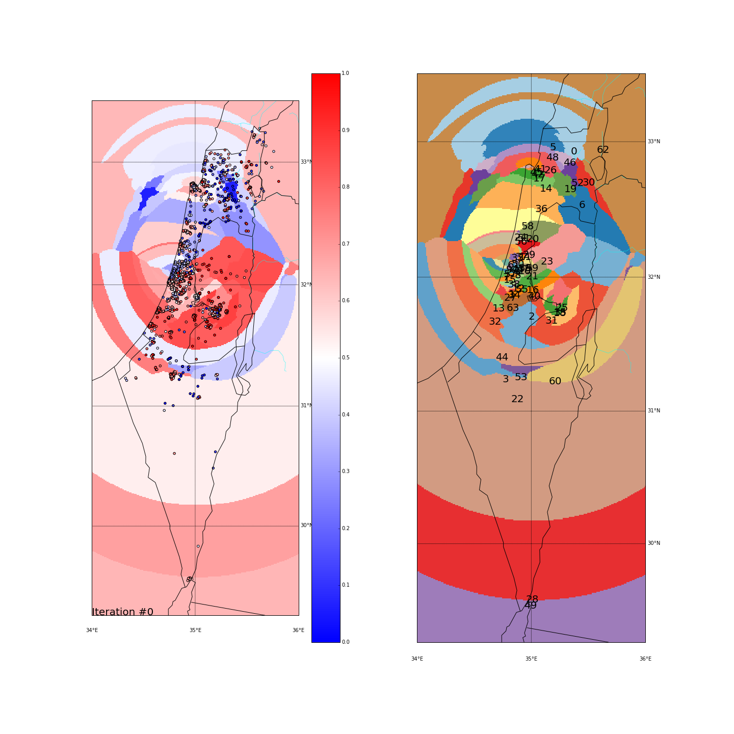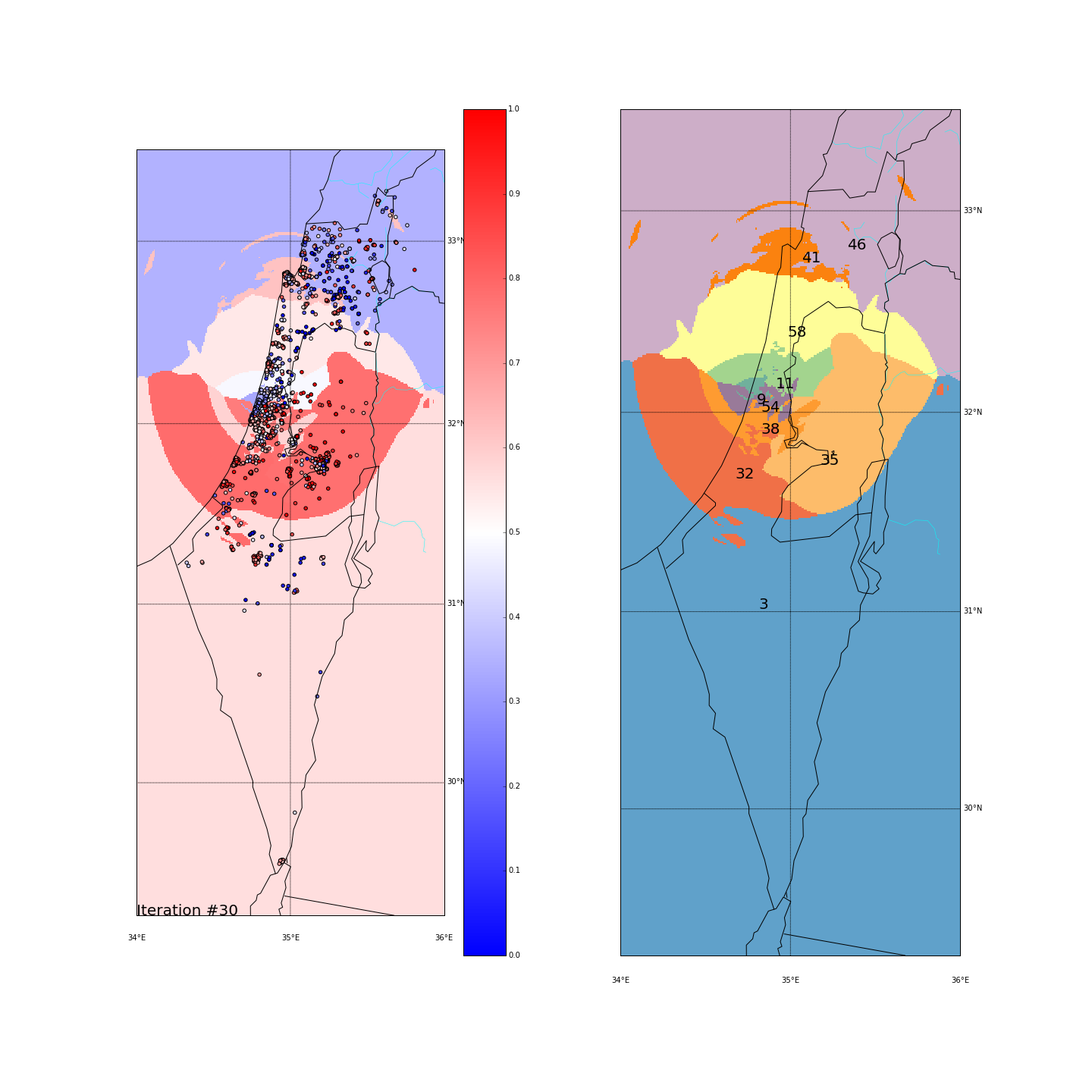 The Negev - A large area with mixed red/blue ballots scattered all over. In the long-lat run it was all clustered together, causing this cluster (#59) to be very heterogeneous (STD of 0.28). In the major-cities run, it was actually grouped together with some ballots up in the north (remember we project all points on the “distance from Tel-Aviv-Haifa-Jerusalem” dimension). That again created a mixed cluster (#46) with STD of 0.32.
